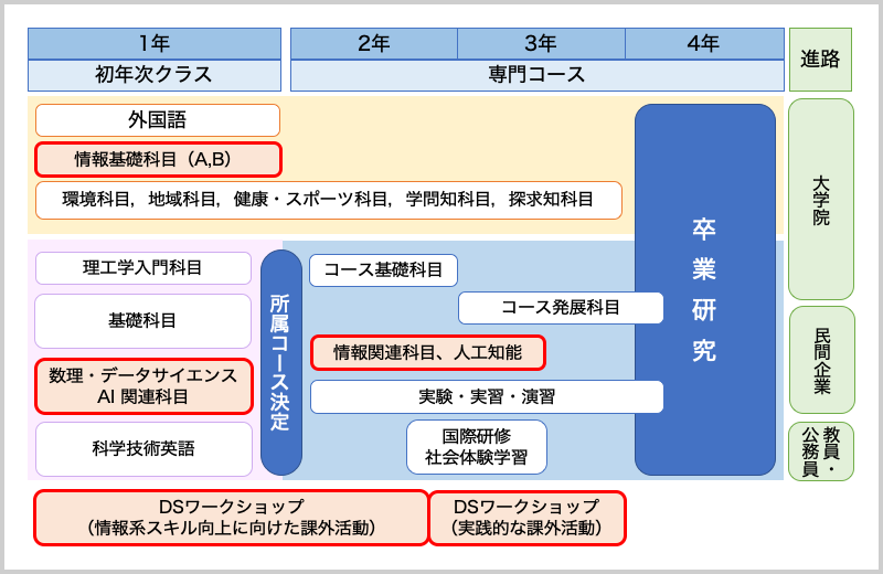 本プログラムは、データサイエンスと理学・工学の様々な専門分野を融合させた「二刀流人材」の育成を目指す教育研究体制が特徴です。初年次には一般科目と並行して特別に実施されるデータサイエンスワークショップ(DSワークショップ)に参加し、自らデータサイエンスを活かす専門分野を考え選択します。2年次以降は希望するコースへ進級し、3年次には研究室との連携による実践的活動が行われます。