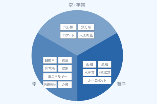 機械・航空宇宙コースの強みは、「地球をマネージメントする」をスローガンにした、様々な視野からの広範なものづくりに関する研究展開にあります。「空」「陸」「海」の全てのフィールドの最先端ものづくりに、機械・航空宇宙コースの研究は繋がっていきます。あなたの博士前期課程の2年間を有意義なものにする「種」が、必ずコースの研究の中にあるはずです。