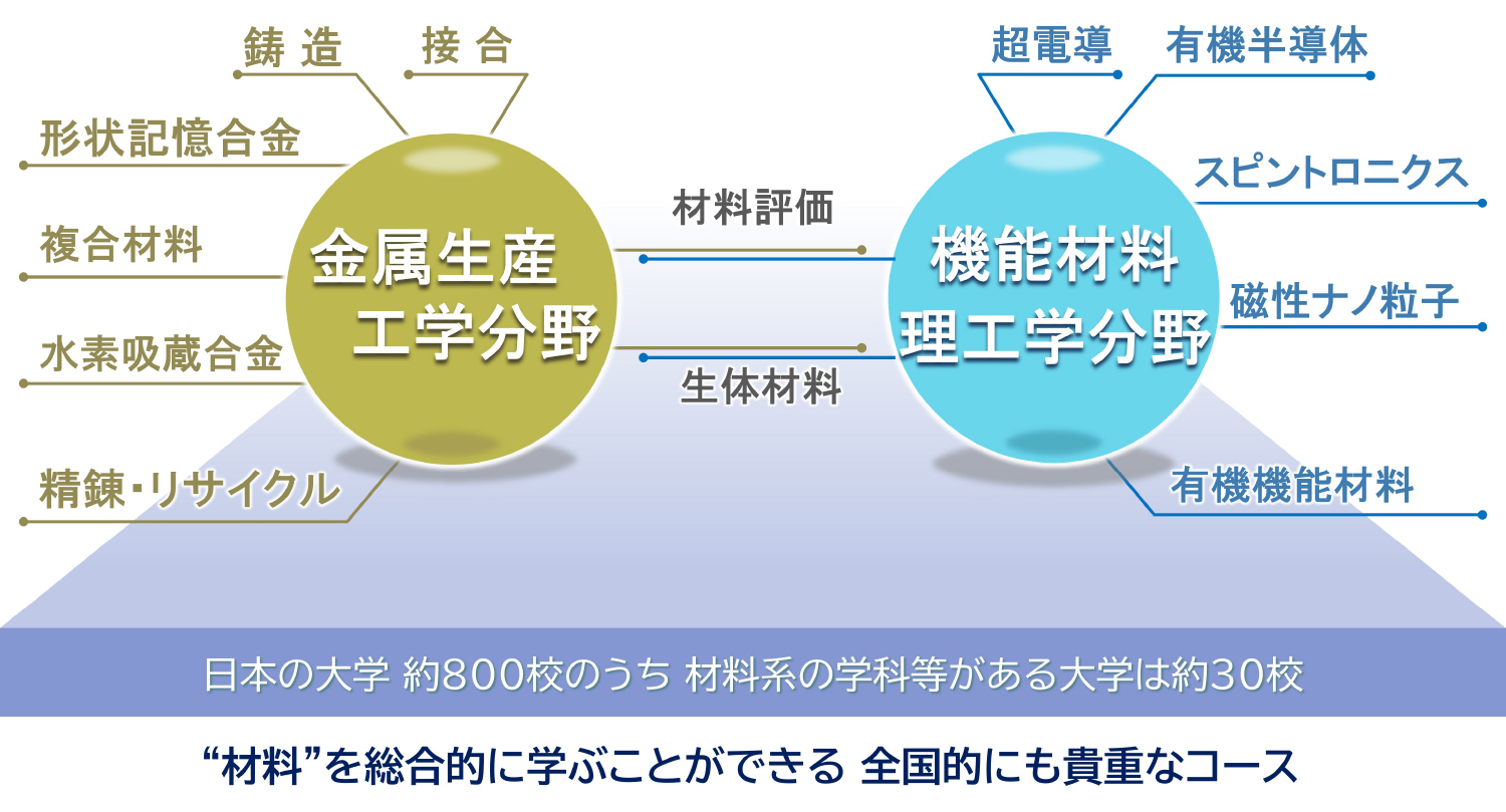 “材料”は産業の要であり、機械、インフラ設備、電子デバイス、医療など幅広い分野で社会にイノベーションをもたらす存在です。“材料”は、ものの形を作るための“構造材料”と、物理的または化学的な特徴を活かした“機能材料”にわけることができます。本コースでは、構造材料を専門とする“金属生産工学分野”と機能材料を専門とする“機能材料理工学分野”の両方で幅広く研究しており、“材料”の観点から様々な問題を解決できる専門家を育成します。
